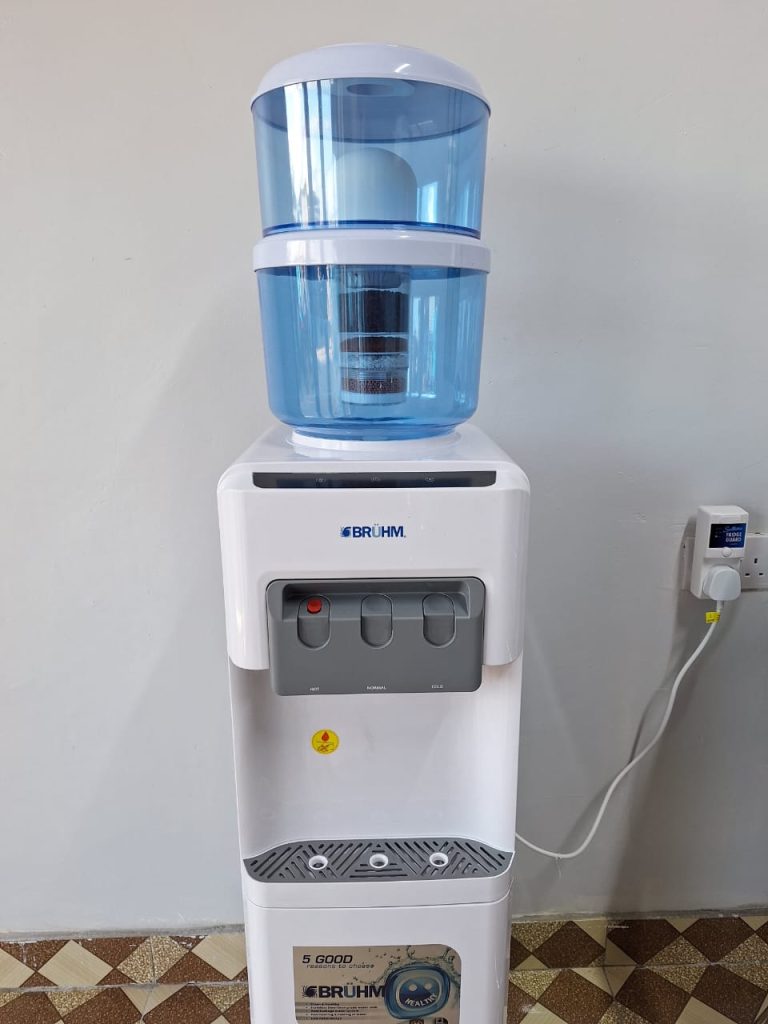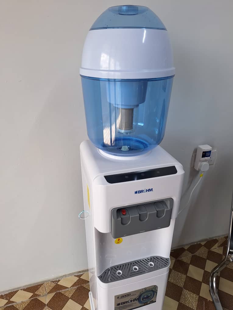 The water purifier with a 19-liter capacity, it is stand-alone, it doesn’t use a water dispenser! It comes complete as seen in the picture. The filters are changed every 6 months. It doesn’t use electricity, so you’ll get regular water, which is the healthiest.